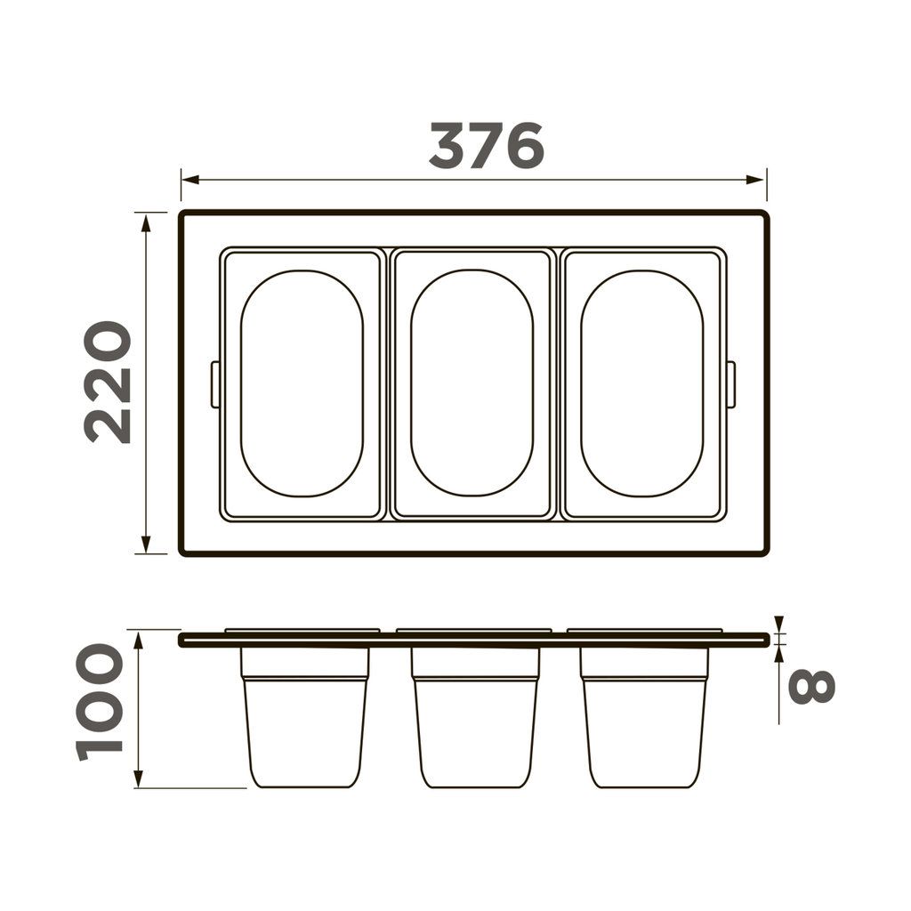 Контейнеры коллекции DC представляют собой различные конфигурации, состоящие из нескольких элементов: одной, двух или трех чаш, изготовленных из нержавеющей стали и фиксирующей подставки, изготовленной из высокопрочного HPL пластика. Чаши свободно вынимаются из пластиковой подставки и перемещаются, а конструкция подставки разработана таким образом, чтобы ее можно было удобно разместить на внутренних ступенчатых направляющих моек, коллекций SINTESI