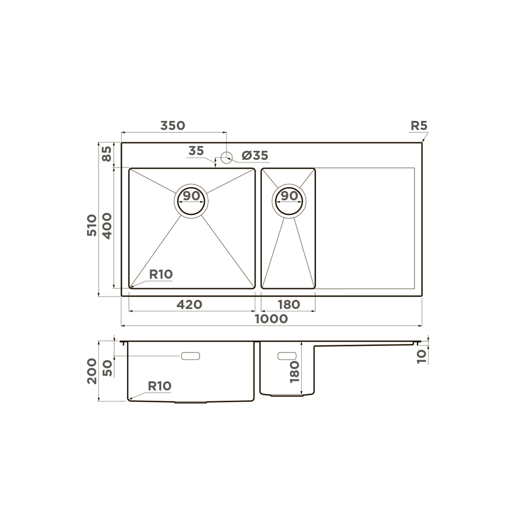 ширина 1000 мм x длина 510 мм x глубина 200 мм