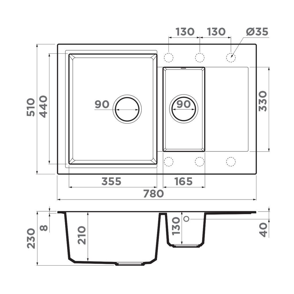 ширина 780 мм x длина 510 мм x глубина 230 мм