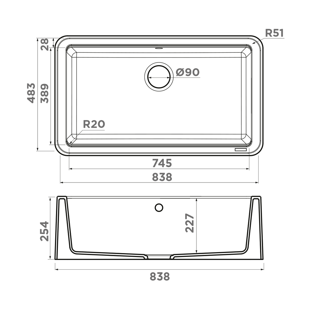 ширина 838 мм x длина 483 мм x глубина 254 мм