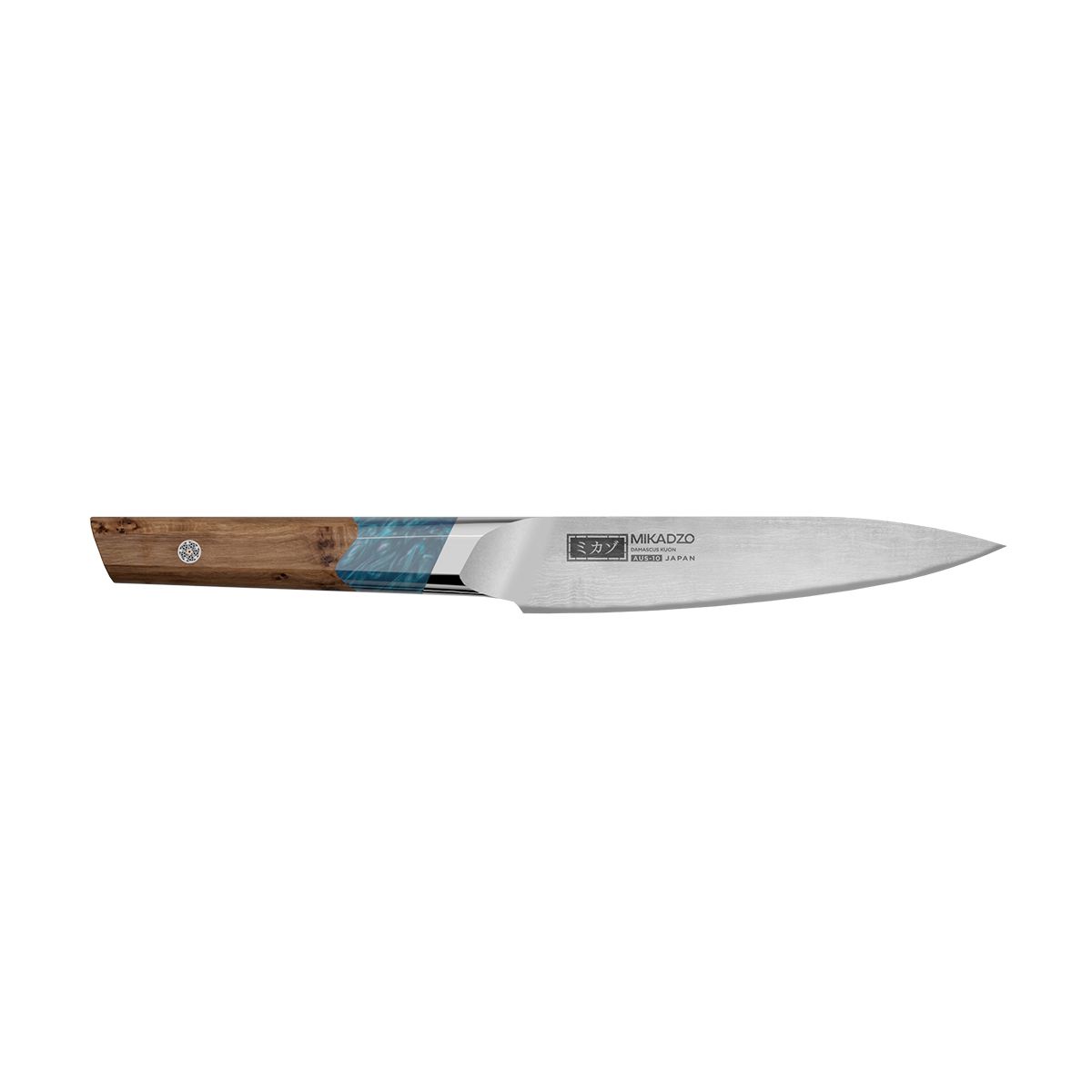 Лезвие ножей Damascus Kuon перетекает в рукоятку без сварки, благодаря однородной стальной основе. Это увеличивает прочность и долговечность ножей. Именно поэтому они называются “Kuon”, что переводится как “Вечность”. Рукоятка состоит из двух частей: декоративной вставки из эпоксидной смолы, переливающегося синего цвета; деревянной основы, выполненной из березового капа (утолщенной части узлов деревьев с повышенной прочностью).