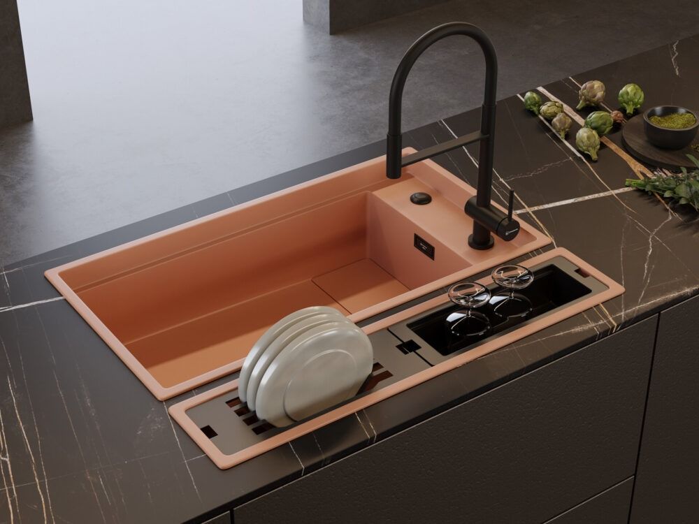 Безусловным плюсом кнопки переключения потока воды со струи на душ является отсутствие брызг в процессе использования смесителя. Вода при таком типе подачи охватывает большую площадь, тем самым делая процесс мытья посуды или ингредиентов для блюд в разы быстрее и гигиеничнее.