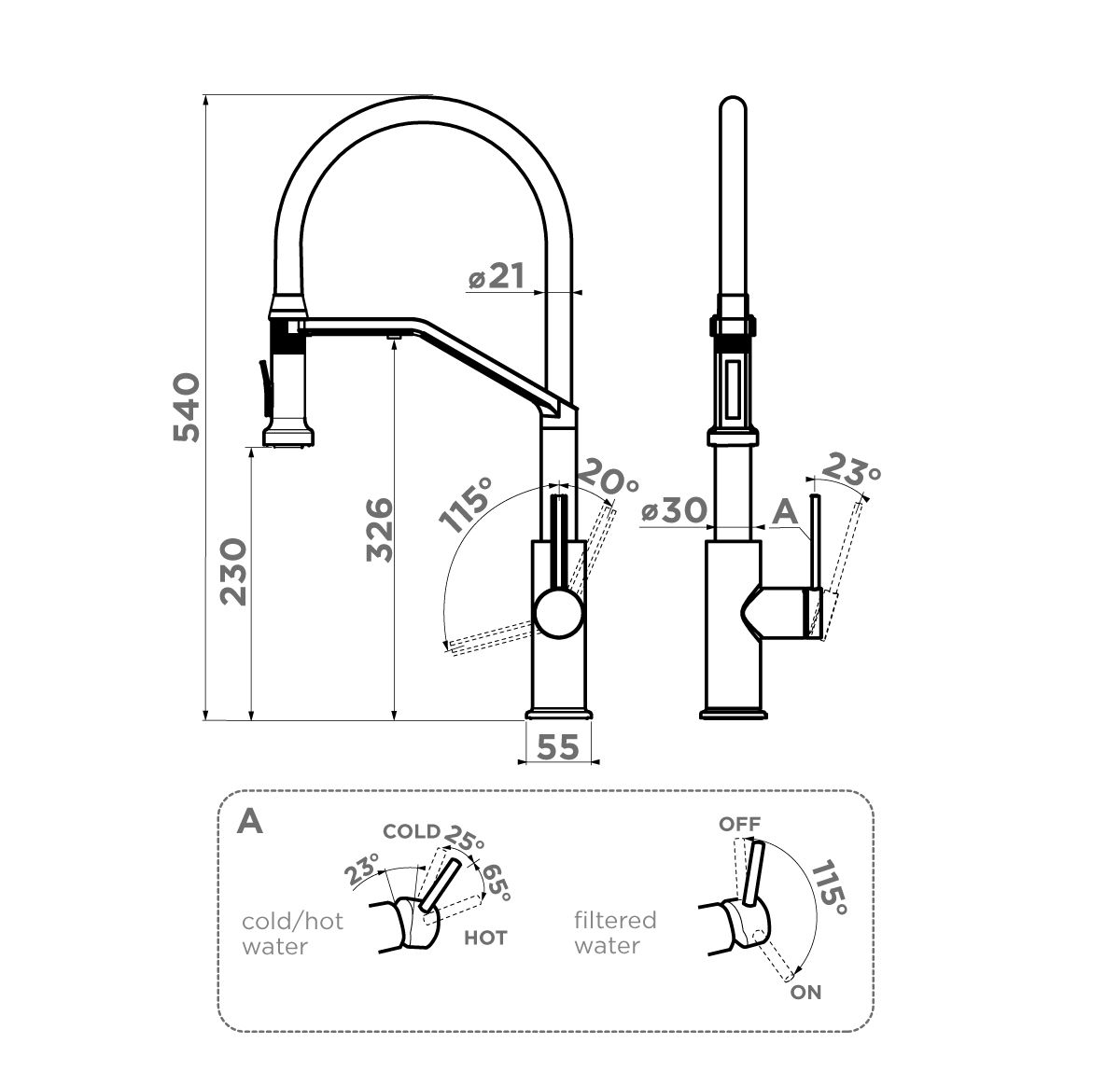 Технология 2 в 1 Multi дает возможность переключать воду с водопроводной на фильтрованную и обратно буквально одним движением руки. С помощью наклона рычага подачи воды под разным углом можно управлять горячей, холодной и питьевой водой.