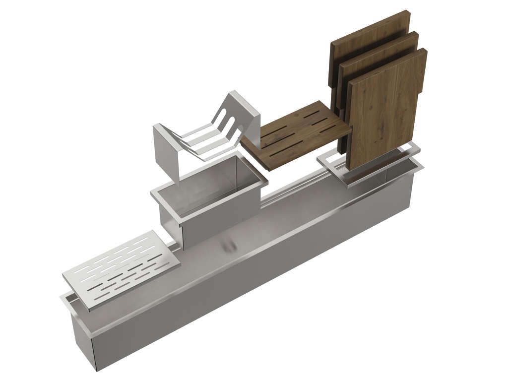 - Комплектация: крепления для врезного и подстольного монтажа, донный клапан, сифон, три разделочных доски из дерева сапеле.